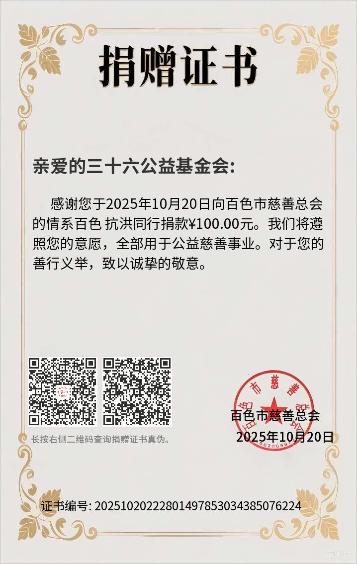 | 社会救灾 | 百色“洪灾救助” | 百色市慈善总会微信公众号 | ¥ 100 | 2025 年 10 月 20 日已完成 | ![]() |